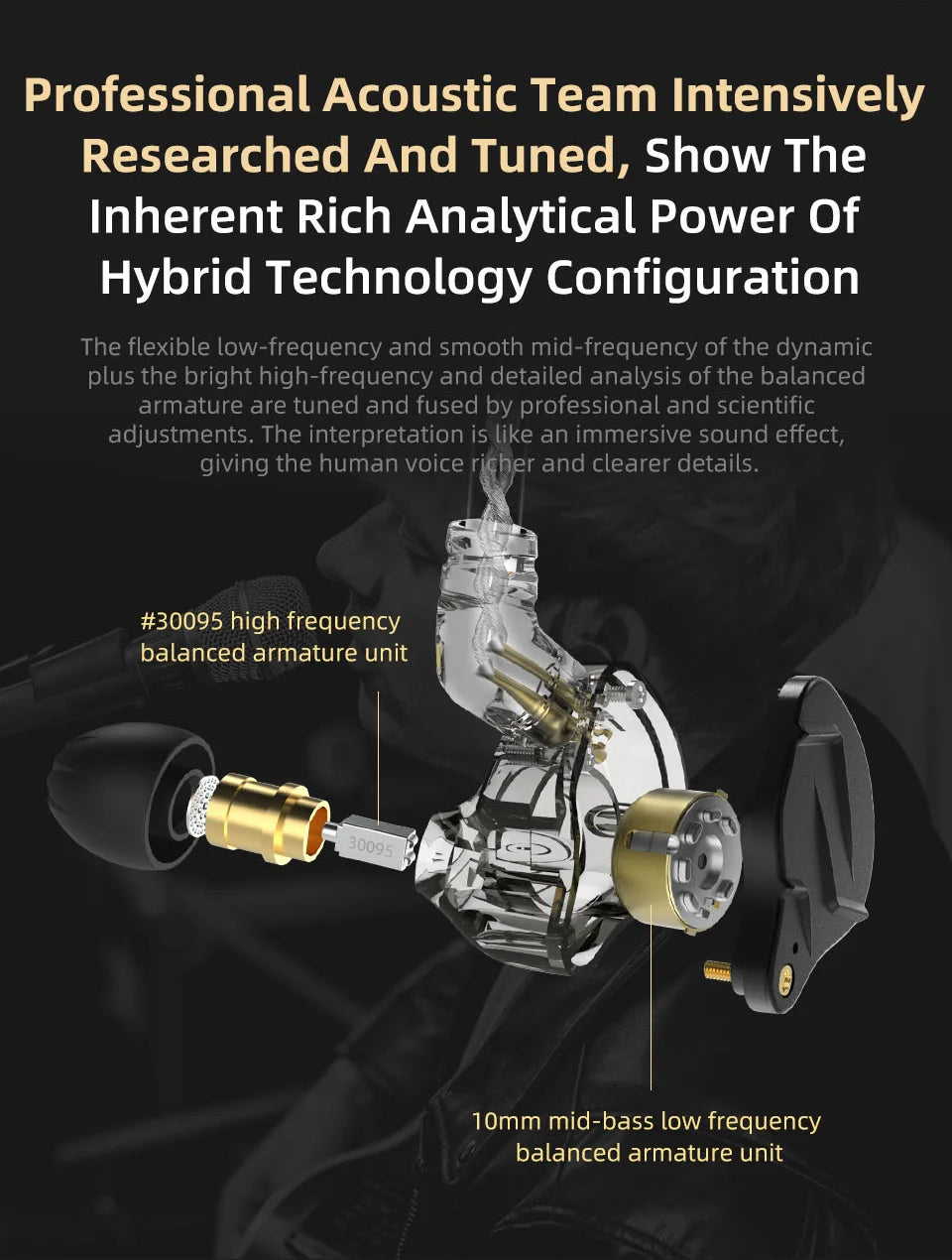 Black Technology's large-format double-spur dynamic drive + 30095 classic balanced armature brings amazing sound appeal.